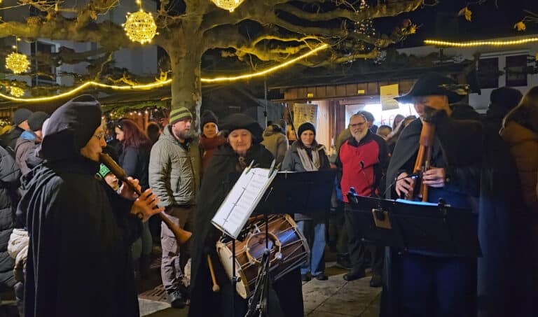 „Gli Zampognari Bavaresi“(Lu Sievers, Ruth Wengenmeier und Dieter Trautwein) traten erstmals auf dem Kissinger Weihnachtsmarkt auf. Auf ihren historischen Instrumenten (Zampogna – Ciaramella – Trommel) stimmten sie mit Weihnachtsliedern aus Europa die Besucher des Weihnachtsmarkts auf das bevorstehende Fest ein.